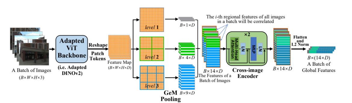 - 经过 Cross-image Encoder 增强后的 14 个区域特征,被拼接 (Flatten) 起来,然后进行 L2 归一化,最终形成该图像的全局特征表示 。